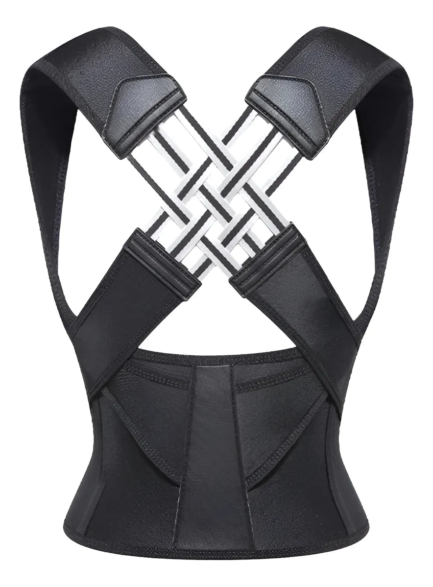 Corrector de postura de diseño avanzado, ideal para quienes buscan alineación vertebral, soporte lumbar y alivio muscular. Su estructura negra con tirantes entrelazados y elementos rígidos ofrece una combinación de estética deportiva y funcionalidad ortopédica. Es una solución discreta y efectiva para mejorar la postura en actividades diarias o durante largas jornadas de trabajo
